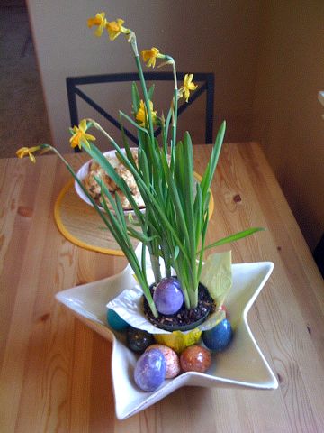 The lovely center-piece features dinosaur eggs and flowers.